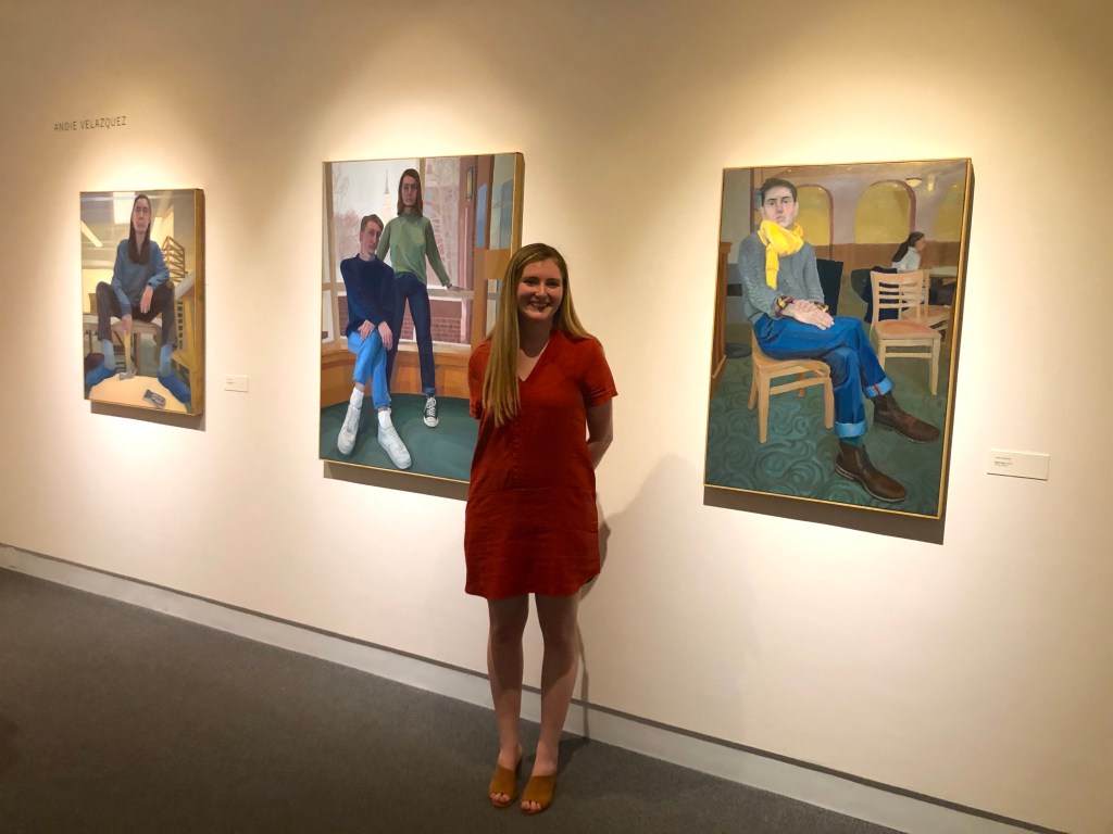 Her first and most recent art show was the Colby Senior Exhibition. Here, she showed her three full-figure paintings that focused on gender-bending and gender fluidity.